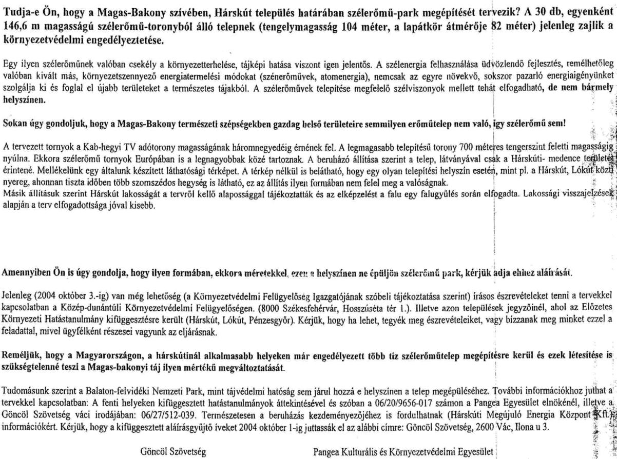 vil szervezeteknek. Ő elmondja a véleményét, mi is elmondjuk, Önök pedig kialakítják a saját véleményüket.Röviden: A szélerőmű telepítése nemcsak Hárskút belügye, mivel nemcsak a falut érinti, hanem regionális ügy. Szervezetünk nem kíván egy faluközösség ügyeivel foglalkozni, viszont aki szakmai segítséget kér tőlünk ilyen és ehhez hasonló esetekben, azt továbbra is megadjuk. A döntés pedig a hatóságok dolga.