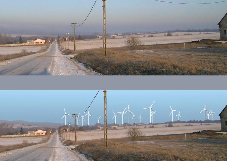 A beruházó szórólapjában azt is állítja, hogy a fotónkon, általunk elhelyezett toronycsoport látványképe nem helyes ( A falu széléről Réh-puszta irányába nézve készült a fotó) Tessék beletekinteni a hatástanulmányba (3.1-es melléklet, gépkiosztási térkép) és látható, hogy a mi munkánk, sajnos, jól, a megfelelő helyen ábrázolja a várható látványt. A beruházó egyébként már két hete említette, hogy majd ők is készítenek ugyanonnan képet. Nem tették meg, a mai napig.